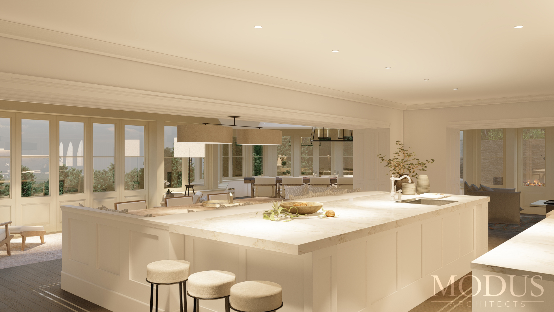 The design has a classic, clean aesthetic with traditional detailing to bring warmth and character to the home, adding light for family living and glamourous space for entertaining while maximising panoramic views of the site's generous garden. This design has a sense of luxury but also suits a family lifestyle. It is a beautiful wrap-around multi-functional living space that can work equally as a kitchen, dining room, and living room whilst connecting the home and garden.