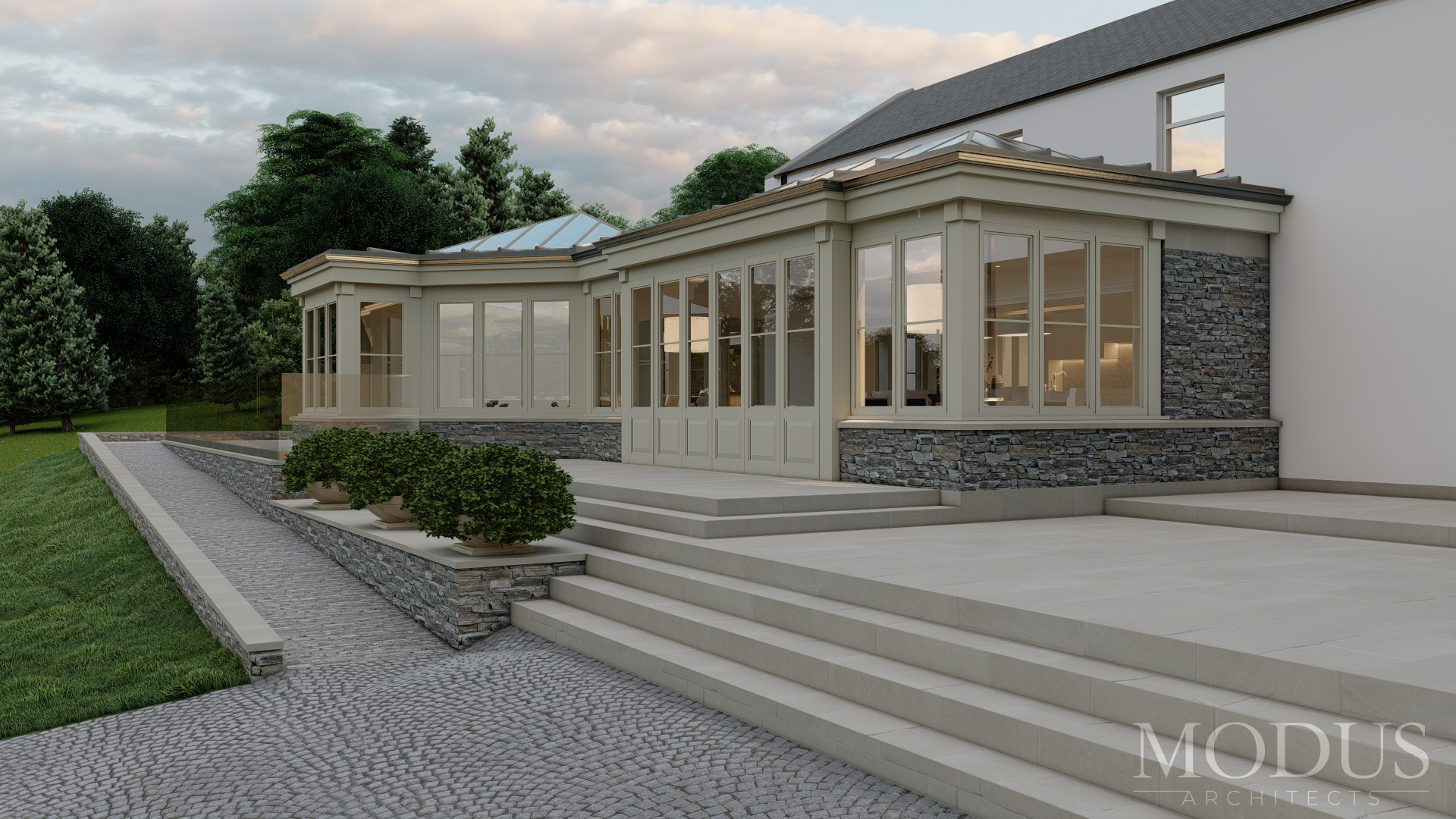 Our client wanted to upgrade their home with a larger kitchen and a spacious kitchen-dining living room that the whole family could enjoy. They also wanted to improve the interior and exterior space flow and let as much light into the home as possible. Our design proposal intensifies the home's appeal with a light-filled one-storey orangery extension, including spacious contemporary living accommodation that flows elegantly onto outdoor terraces. The landscaping has been designed according to best practice guidelines ensuring that visitors with different abilities and needs can easily reach the house.